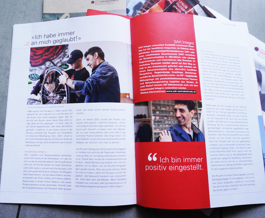 Vito Ricupero bezog zwei Jahre lang Krankentaggeld, er meldete sich auch bei der Regionalen Arbeitsvermittlung RAV an und bezog Arbeitslosenunterstützung. Parallel dazu wurde die Invalidenversicherung IV aktiv: «Sechs Monate lang testete man mich eingehend, um zu klären, wie ich beruflich eingegliedert werden könnte. Man versuchte intensiv, Arbeit für mich zu finden», blickt Vito Ricupero zurück. Vergeblich – der Gang aufs Sozialamt war unausweichlich. Doch dann kam die Wende: «Beim Sozialamt meldete man mich beim SAH Zentralschweiz an, fürs Arbeitsintegrationsprogamm SAH Integro.»