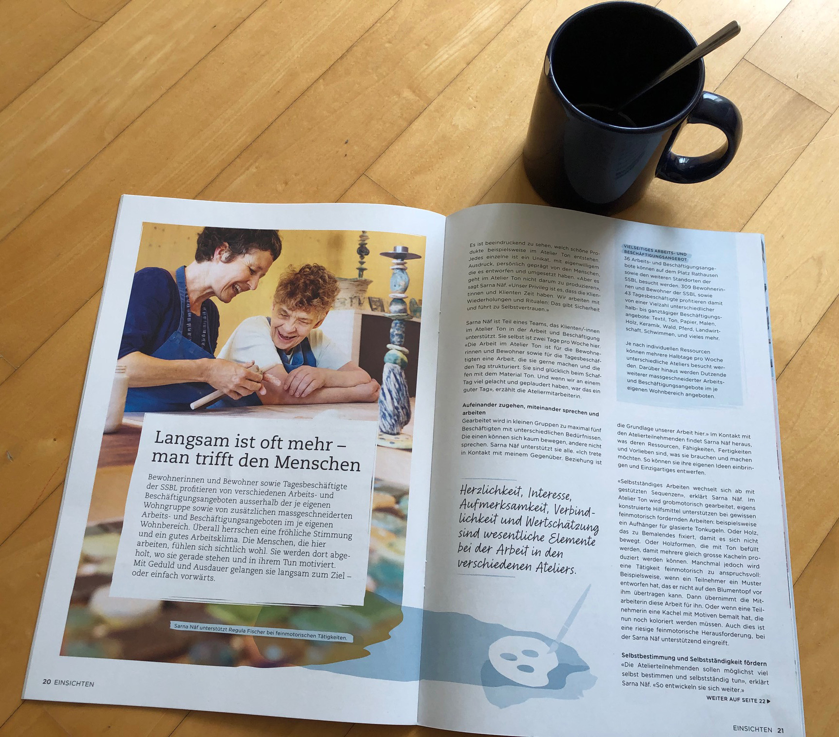 Es ist beeindruckend zu sehen, welch schöne Produkte beispielsweise im Atelier Ton entstehen. Jedes einzelne ist ein Unikat, mit eigenwilligem Ausdruck, persönlich geprägt von den Menschen, die es entworfen und umgesetzt haben. «Aber es geht im Atelier Ton nicht darum zu produzieren», sagt Sarna Näf. «Unser Privileg ist es, dass die Klientinnen und Klienten Zeit haben. Wir arbeiten mit Wiederholungen und Ritualen: Das gibt Sicherheit und führt zu Selbstvertrauen.»